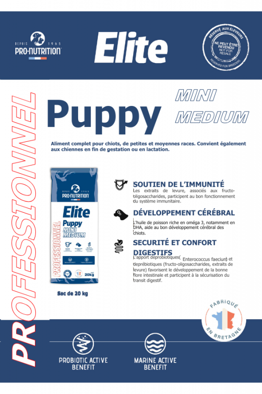 Croquettes PRO NUTRITION fabriquées en Bretagne - l'Elite Puppy Mini Médium est un aliment complet pour chiots, de petites et moyennes races. Il convient également aux chiennes en fin de gestation ou en lactation.