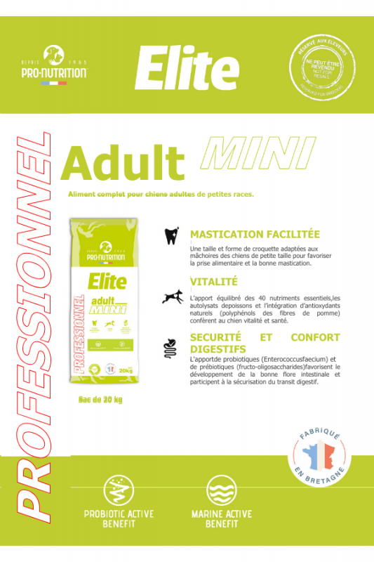 Pour une mastication facilitée, une sécurité et confort digestif ainsi que pour donner de la vitalité à votre chien, l'Elite Adult Mini de PRO NUTRITION est l'aliment fait pour votre chien adulte de petites races.